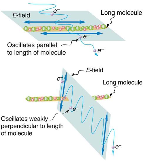 Figure 10 illustrates how the component of the electric field parallel to the long molecules is absorbed. An electromagnetic wave is composed of oscillating electric and magnetic fields. The electric field is strong compared with the magnetic field and is more effective in exerting force on charges in the molecules. The most affected charged particles are the electrons in the molecules, since electron masses are small. If the electron is forced to oscillate, it can absorb energy from the EM wave. This reduces the fields in the wave and, hence, reduces its intensity. In long molecules, electrons can more easily oscillate parallel to the molecule than in the perpendicular direction. The electrons are bound to the molecule and are more restricted in their movement perpendicular to the molecule. Thus, the electrons can absorb EM waves that have a component of their electric field parallel to the molecule. The electrons are much less responsive to electric fields perpendicular to the molecule and will allow those fields to pass. Thus the axis of the polarizing filter is perpendicular to the length of the molecule.