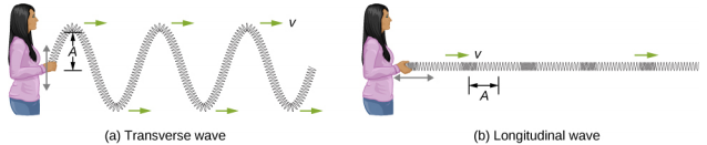 We have seen that a simple mechanical wave consists of a periodic disturbance that propagates from one place to another through a medium. In Figure \(\PageIndex{3}\)(a), the wave propagates in the horizontal direction, whereas the medium is disturbed in the vertical direction. Such a wave is called a transverse wave. In a transverse wave, the wave may propagate in any direction, but the disturbance of the medium is perpendicular to the direction of propagation. In contrast, in a longitudinal wave or compressional wave, the disturbance is parallel to the direction of propagation. Figure \(\PageIndex{4}\)(b) shows an example of a longitudinal wave. The size of the disturbance is its amplitude A and is completely independent of the speed of propagation v.
