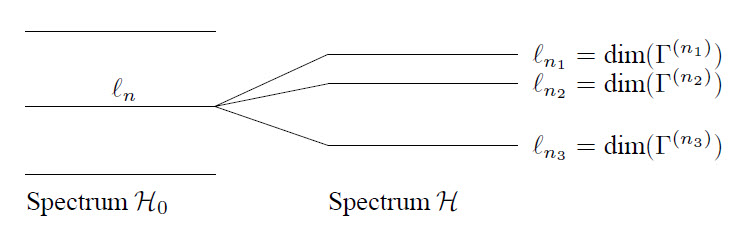 Suppose the unperturbed system has Hamiltonian \(\cal{H}_0\) and symmetry group \( \cal{G}_0\). The perturbed system has \(\cal{H} =\cal{H}_0+\cal V\), and symmetry group \(\cal{G} \subset{\cal{G}}_0\). If \(\Gamma^{(n)}(R)\) is an irreducible representation of \(\cal{G}_0\), it is also a representation of \( \cal{G}\) but not all elements of \(\Gamma^{(n)}\) in \(\cal{G}_0\) are also in \(\cal{G}\). The representation then usually becomes reducible: \(\Gamma^{(n)}=\Gamma^{(n_1)}\oplus\Gamma^{(n_2)}\oplus\ldots\). The degeneracy is then (possibly partially) removed: see the figure below.